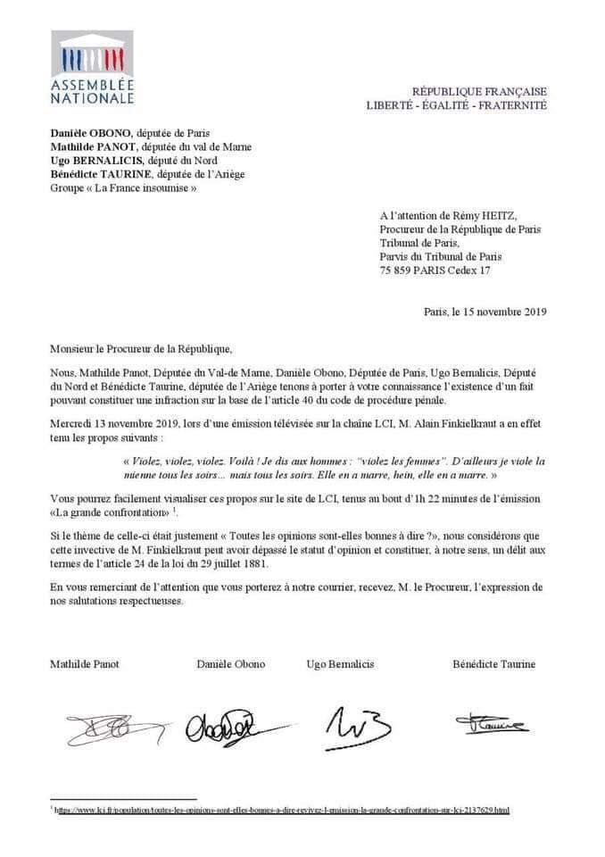 Quatre députés du groupe d’extrême gauche LFI, dont au moins un est membre du parti communiste, ont saisi le procureur de la République pour des propos ironiques tenus par Alain Finkielkraut dans un débat télévisé (celui-ci, excédé d’être accusé par une entrepreneuse identitaire de banaliser le viol parce qu’il déconstruisait le concept idéologique de « culture du viol », avait repris ironiquement son accusation en disant « Violez, violez », pour montrer le ridicule qu’il y avait à lui reprocher de soutenir le viol. Les quatre députés LFI/communistes semblent ne pas connaître le concept d’ironie, j’y reviendrai.)
