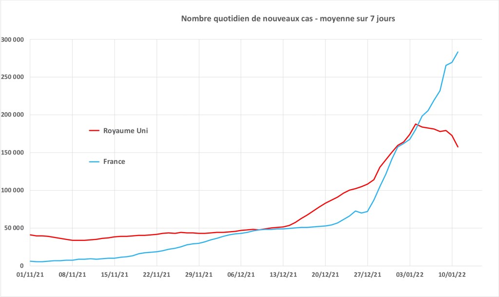 L’explosion des cas liés à omicron a eu lieu à partir du 15 décembre au Royaume-Uni. Elle semble y avoir atteint un sommet autour du 4 janvier et décroit depuis de manière significative. En France la hausse liée à omicron a commencé plus tard (sans doute autour du 25 décembre) et elle se prolonge sans ralentir.